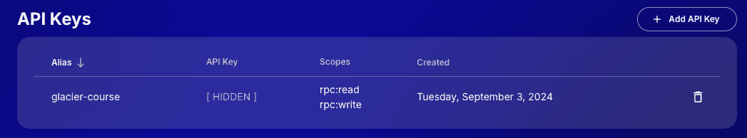 Once you've created and retrieved the key, you will be able to make authenticated queries by passing in your API key in the x-glacier-api-key header of your HTTP request.