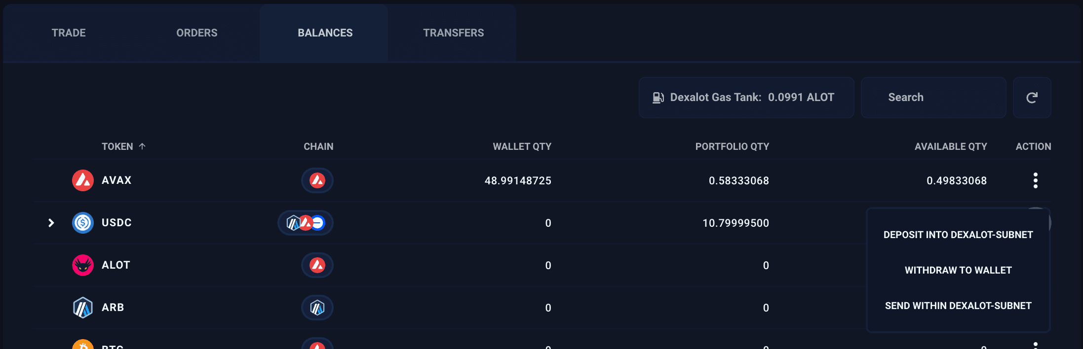 From the Balances tab, withdraw your AVAX and USDC back to the Fuji C-Chain by clicking on the "Withdraw To Wallet" option in the drop down menu: