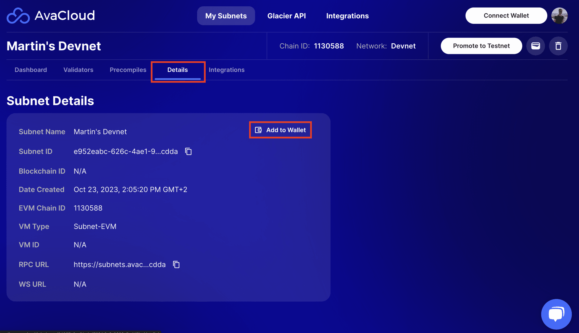 We can simply navigate to the Avalanche L1's details we require for connection, by clicking the arrow and then the Details tab. There click the Add to Wallet button.