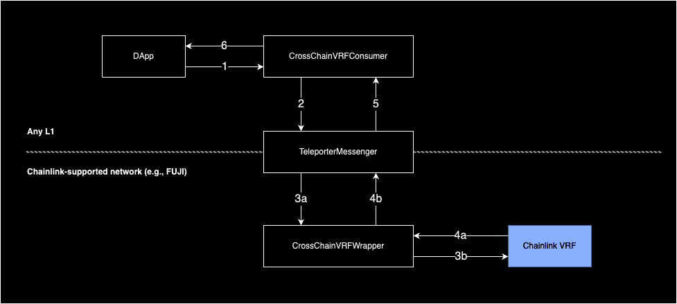 TeleporterMessengerreceives the cross-chain message sent by theCrossChainVRFConsumer. It passes the message to theCrossChainVRFWrapper, which is authorized to handle VRF requests. - The