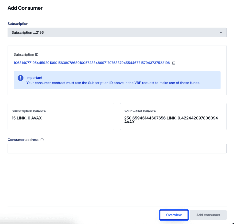 After completing these steps, save your subscription ID. You will need this ID when configuring the CrossChainVRFWrapper contract to request random words.